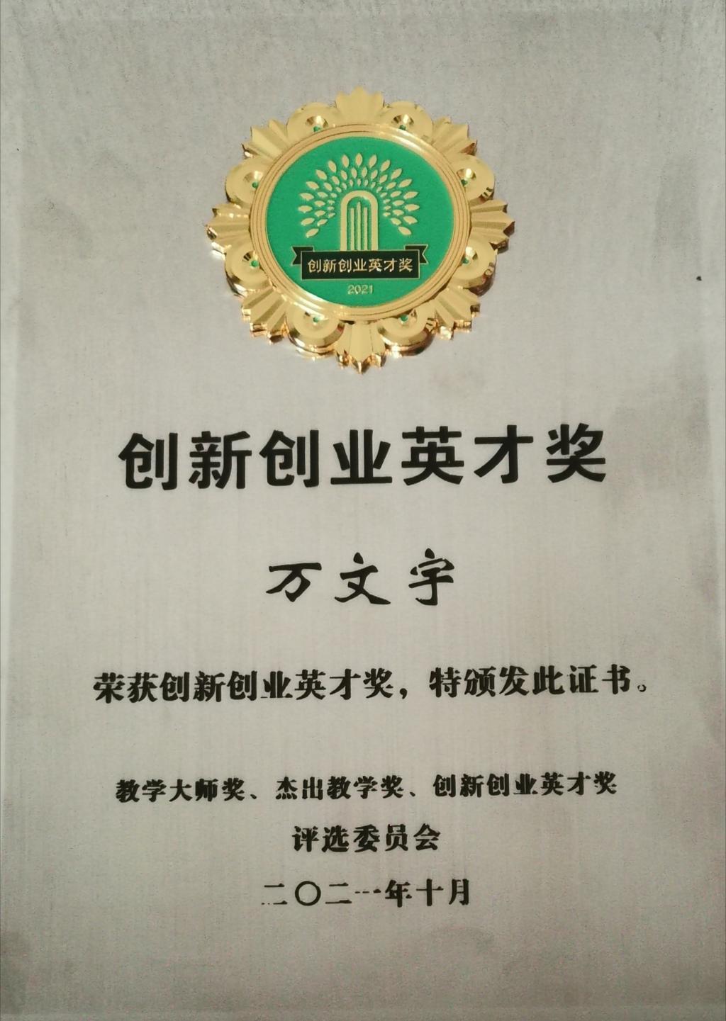 在由中国教师发展基金会主办的2021年度第三届“教学大师奖、杰出教学奖和创新创业英才奖”评选中,万文宇的创业典型案例与全国“双一流”等本科院校学生同台、和博硕士创业者共竞,得到了由院士和资深学者专家的高度好评,入选2021十大创新创业英才奖。