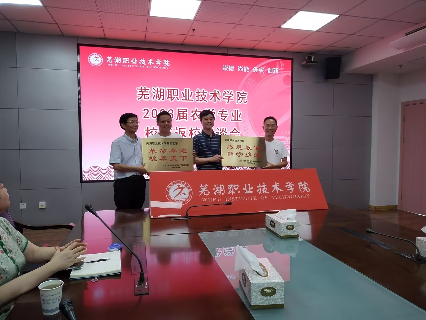 热情似火赛骄阳,胜友如云齐谈畅。8月5日,芜湖职业技术学院2003届农学专业的校友们在这个充满阳光与热情的盛夏齐聚母校,学校在正德楼1112会议室召开毕业二十周年师生座谈会,党委委员、副院长季慕寅,食品与生物工程学院党总支书记彭常安,园林园艺学院院长桂美根以及部分老教师代表参加了座谈会,会议由机关党委书记、校友办主任钟瑞主持。