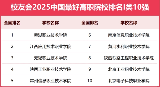 校友会中国最好大学排名前身为“中国最佳大学排行榜”,自2012年首次发布以来,已成为社会各界了解、比较全国高校办学实力和水平的重要参考依据。2025年中国最好高职院校排名基于2021-2025年中国高职院校排名百强数据统计得出,重点评价院校的学科建设、人才培养和社会贡献等核心指标。校友会中国高职院校排名首发于2021年,坚持实施中国大学分类评价,依据高职院校优势学科专业所属门类,中国高职(专科)院校被分为 I 类、Ⅱ类和Ⅲ类共 3 个类型进行分类评价。其中,Ⅰ类院校为以工学门类学科专业为优势的高职院校,Ⅱ类院校为以理学及人文社科门类学科专业为优势的高职院校,Ⅲ类院校为以艺术、体育、经济、管理、农学、教育学、医学等门类学科专业为优势的高职院校。