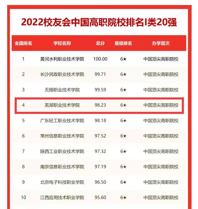 1月25日,全国第三方大学评价机构艾瑞深校友会网(Cuaa.Net)正式发布《2022校友会中国大学排名—高考志愿填报指南》,公布最新2022中国高职院校排名。我校位居2022中国高职院校排名(Ⅰ类)第四位,为排名前十中安徽省唯一高职院校。